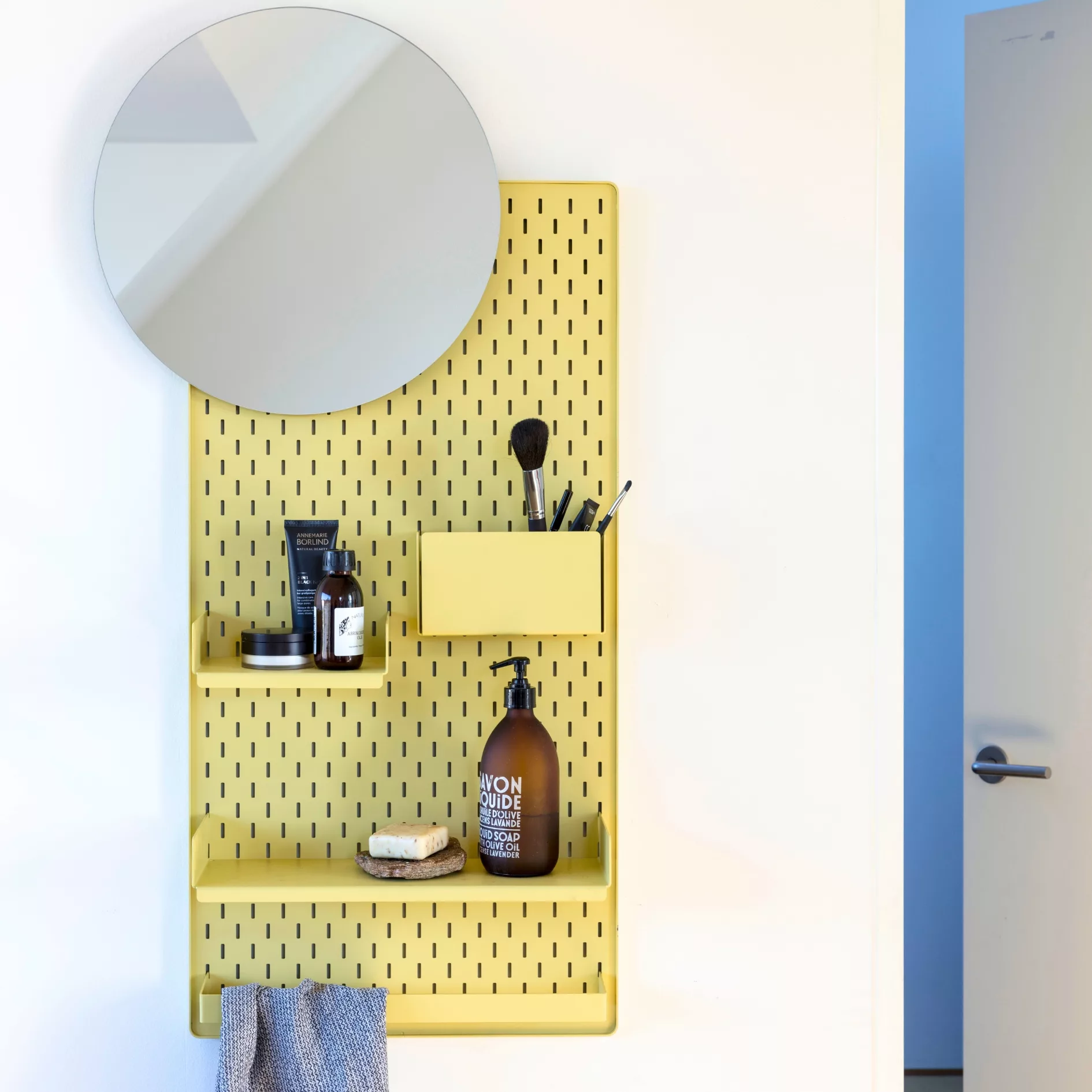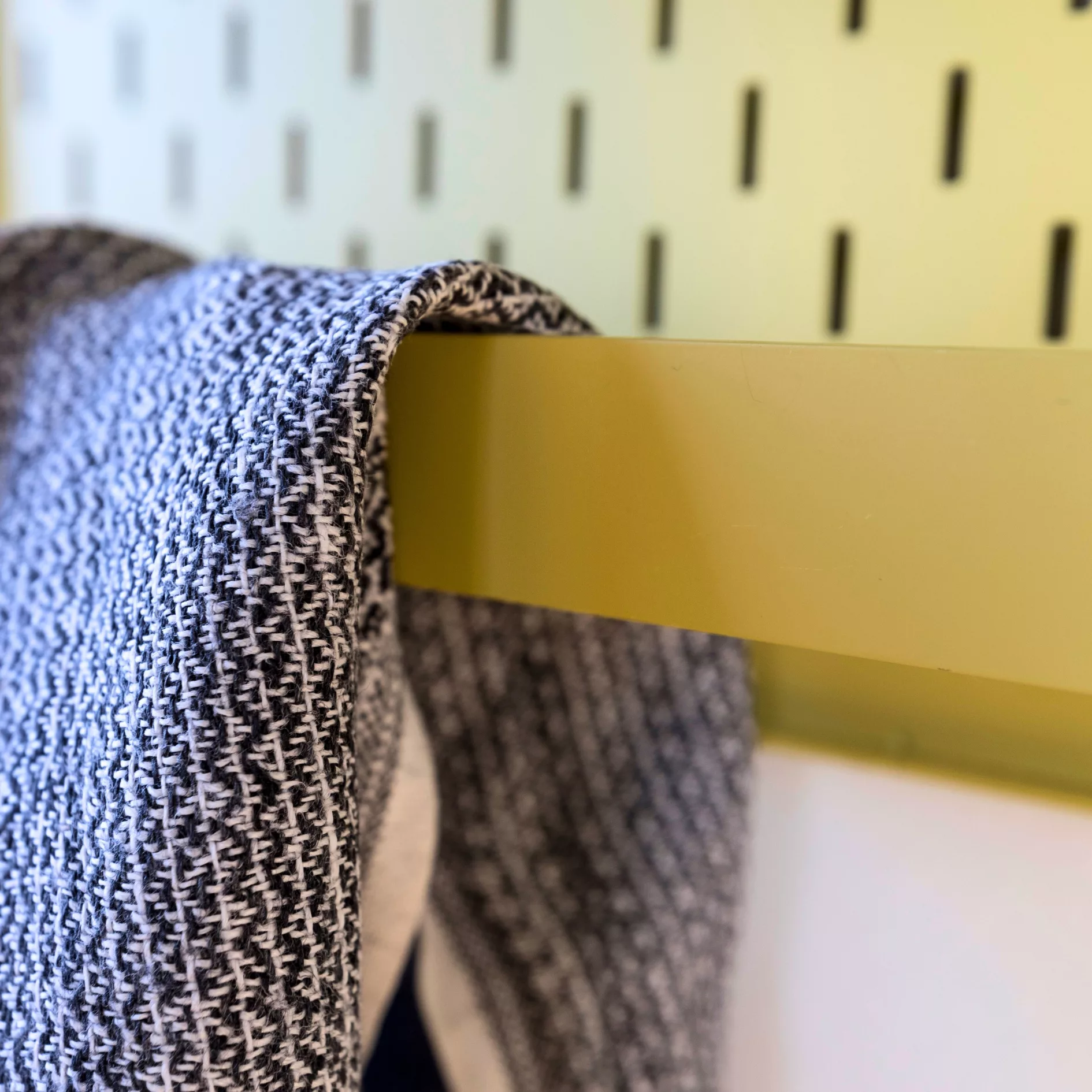 現代人追求個性化、個人化,反映在生活上,也希望擁有一個具有個人特色的收納系統。毛巾掛架懸掛在下方,可吊掛毛巾等輕盈的衣物。