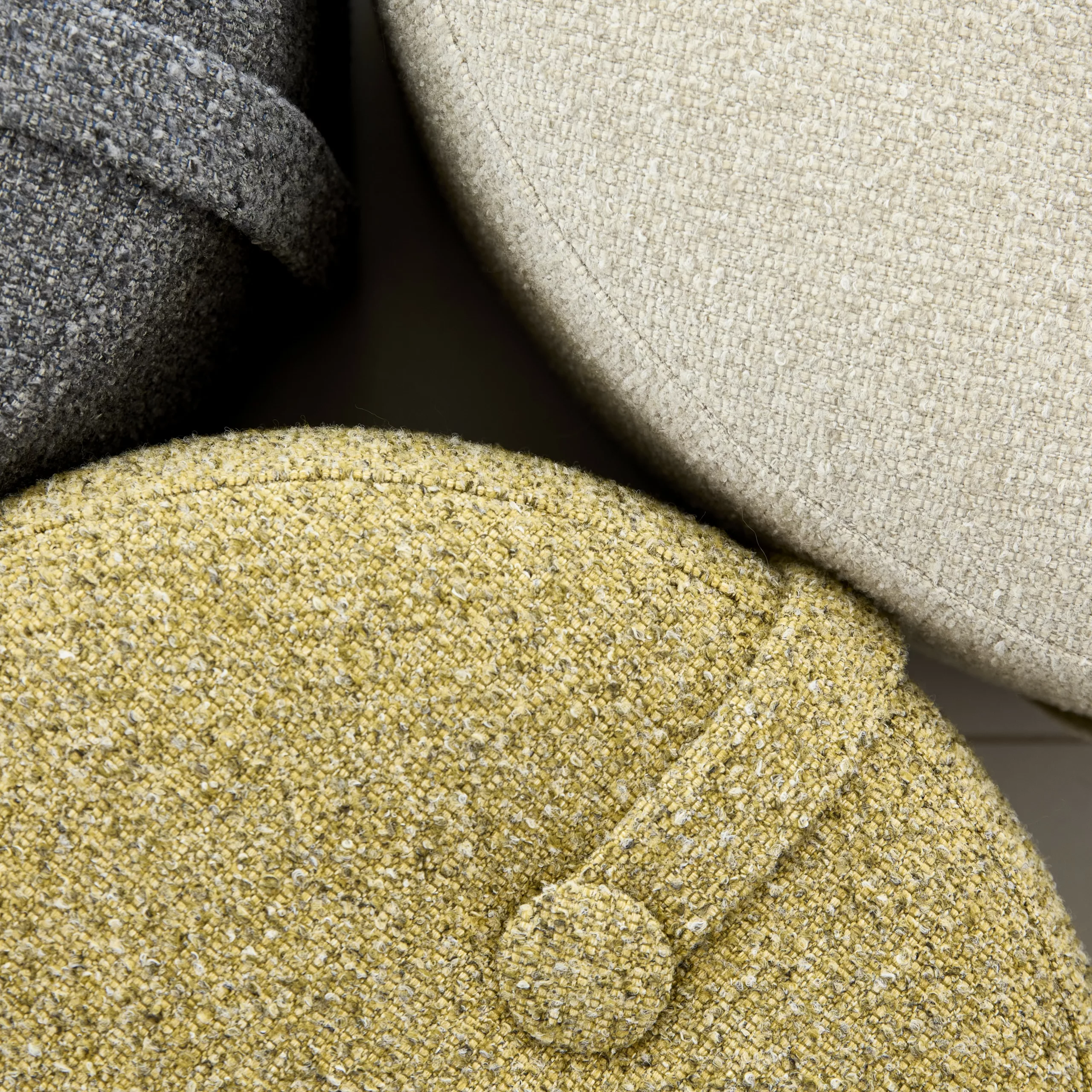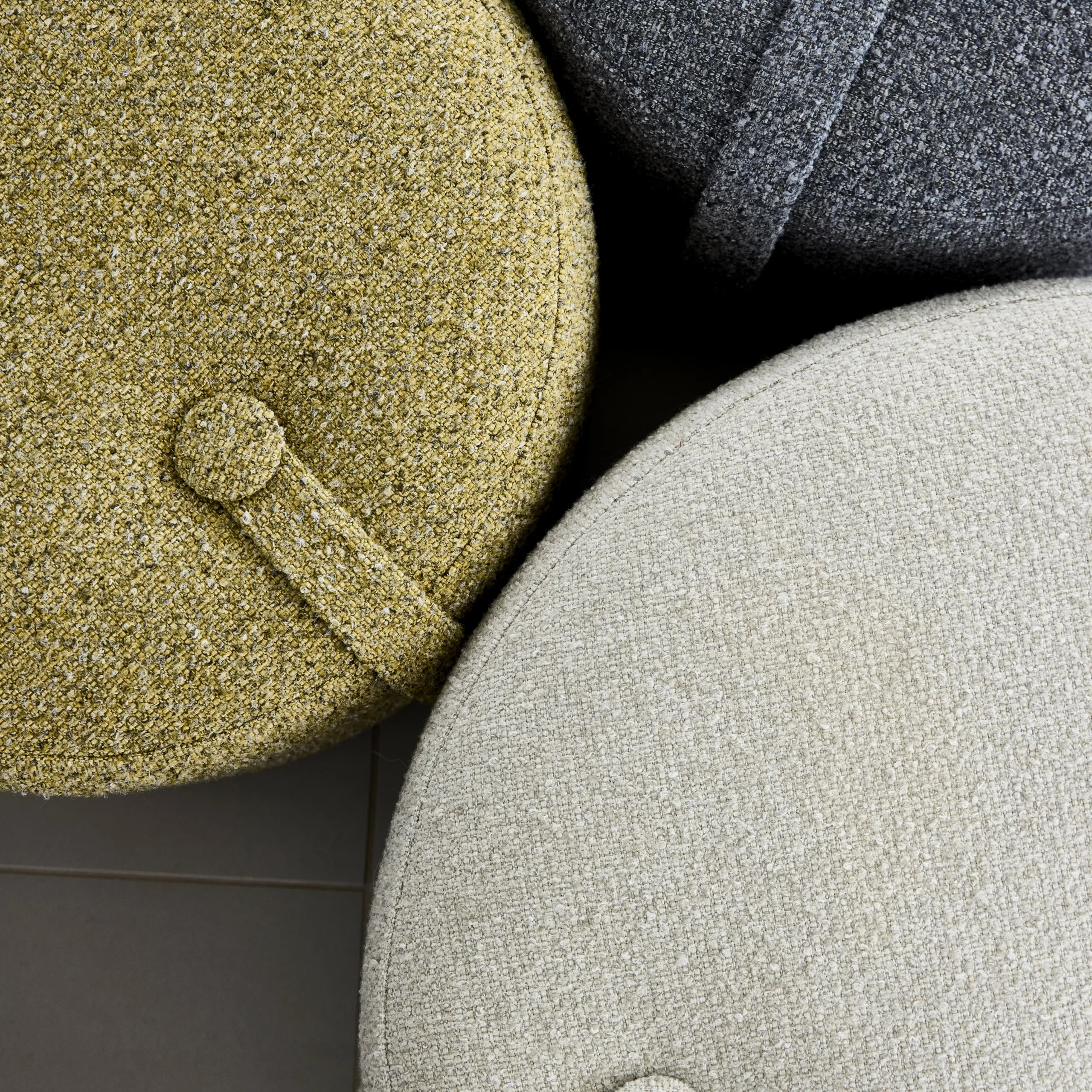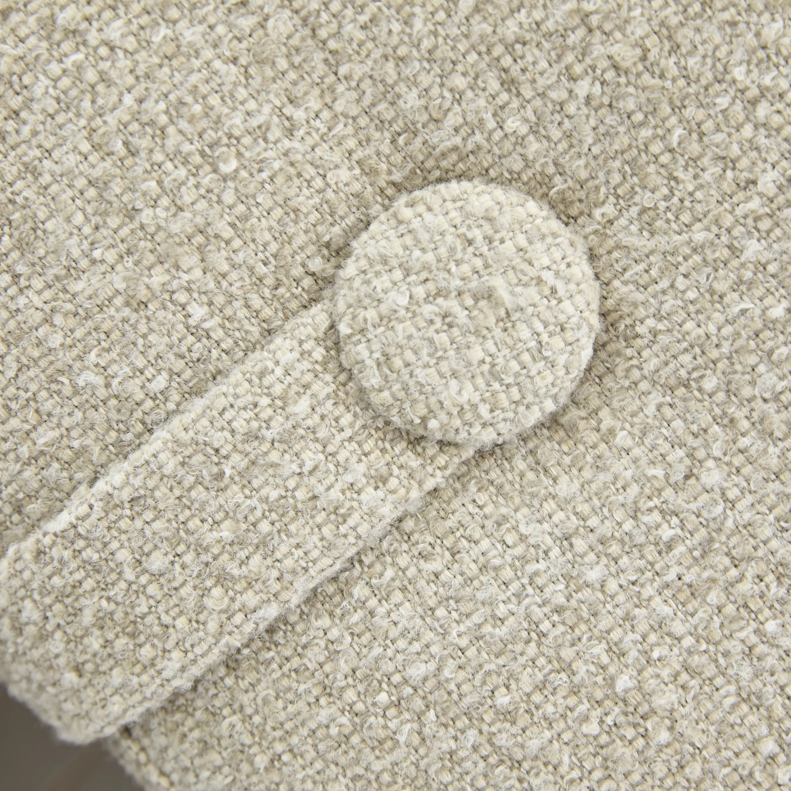 Loop Pouf 泡芙椅配有實用的提帶與裝飾鈕扣設計,讓移動變得輕鬆自然,也為空間增添一份隨性優雅。外層選用柔軟的粗花呢質感布料,提供三款精選色調;內部結構則以 FSC 認證的再利用木材製成,填充回收地毯纖維,並覆以環保再生布料,在舒適坐感與永續理念之間取得完美平衡。