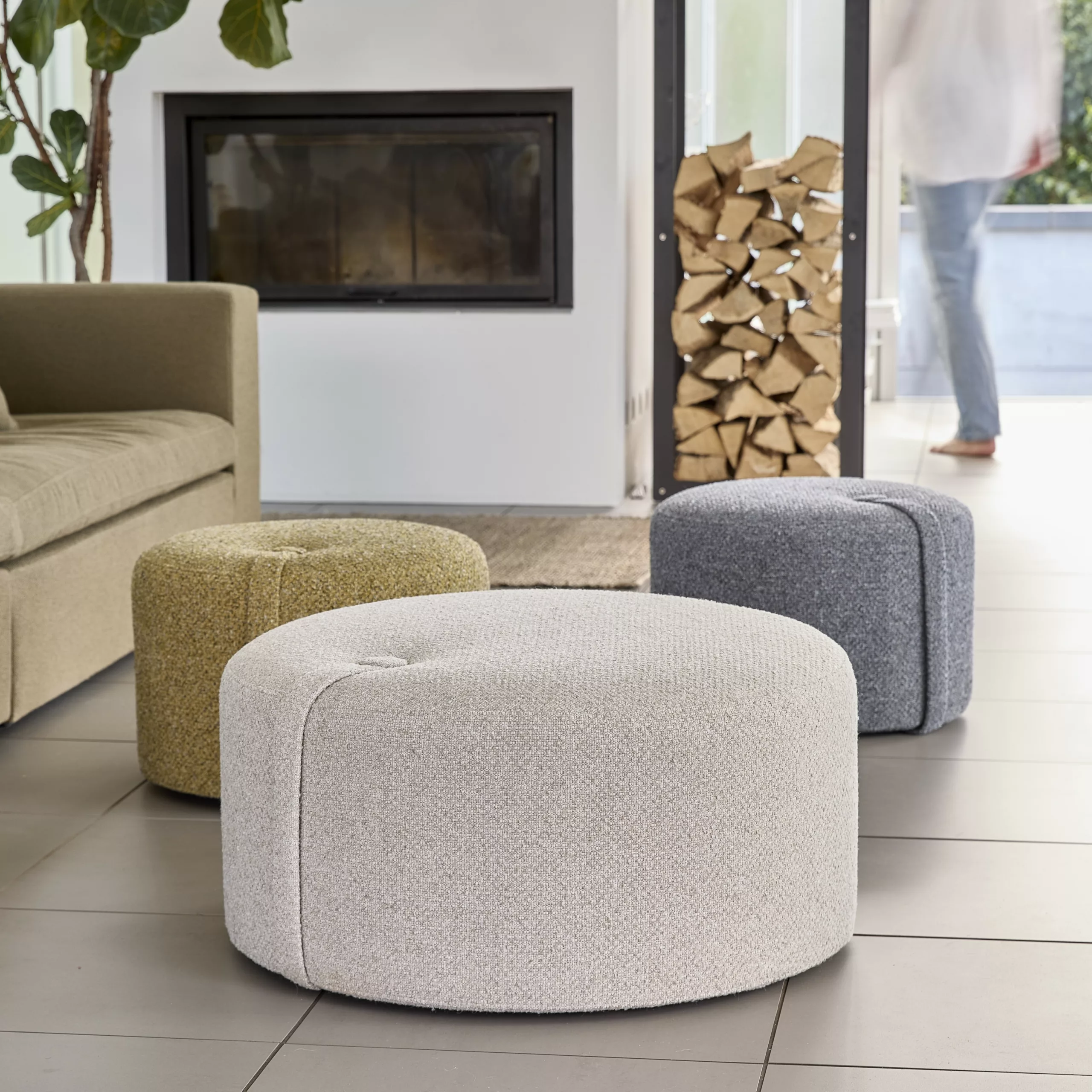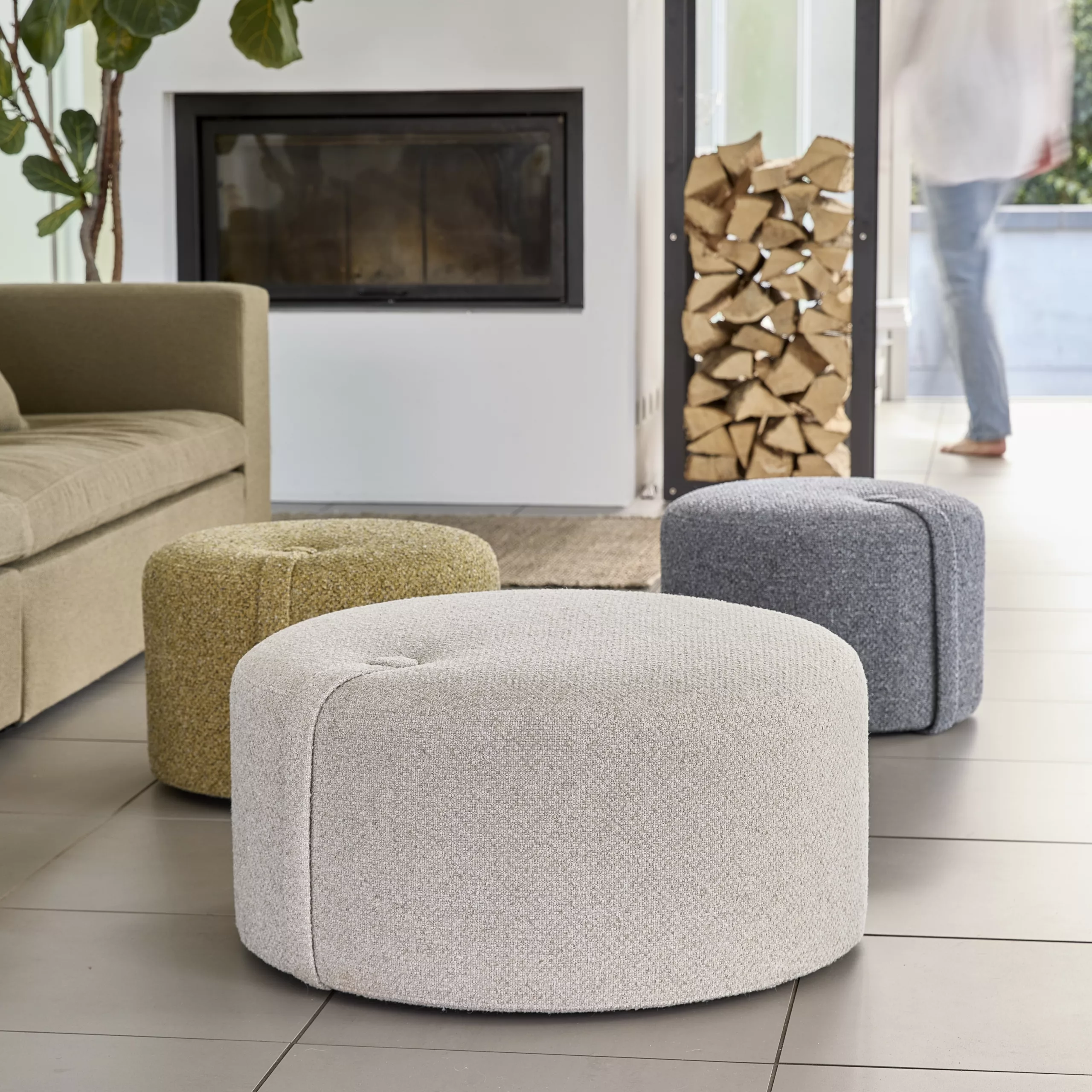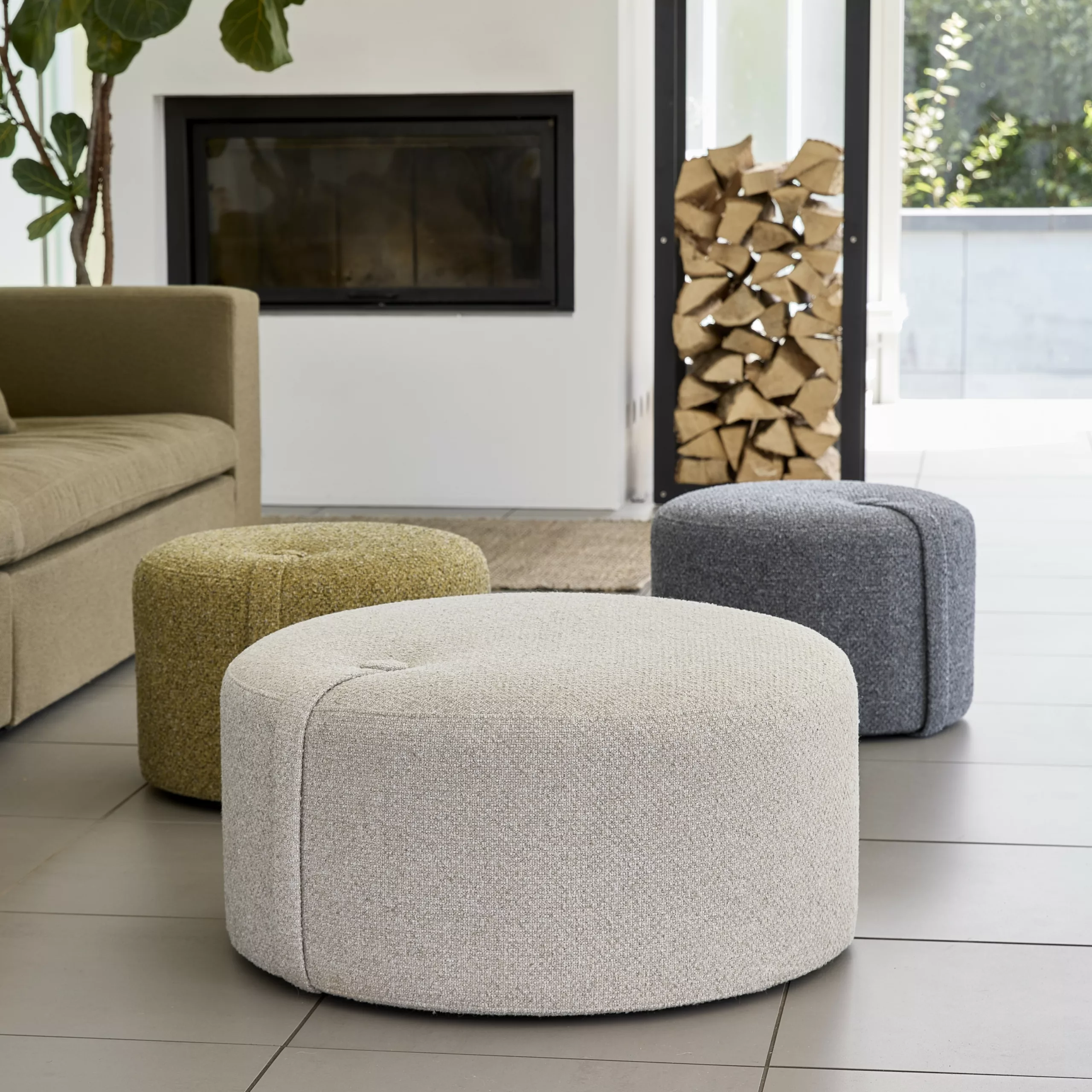 Loop Pouf 泡芙椅配有實用的提帶與裝飾鈕扣設計,讓移動變得輕鬆自然,也為空間增添一份隨性優雅。外層選用柔軟的粗花呢質感布料,提供三款精選色調;內部結構則以 FSC 認證的再利用木材製成,填充回收地毯纖維,並覆以環保再生布料,在舒適坐感與永續理念之間取得完美平衡。